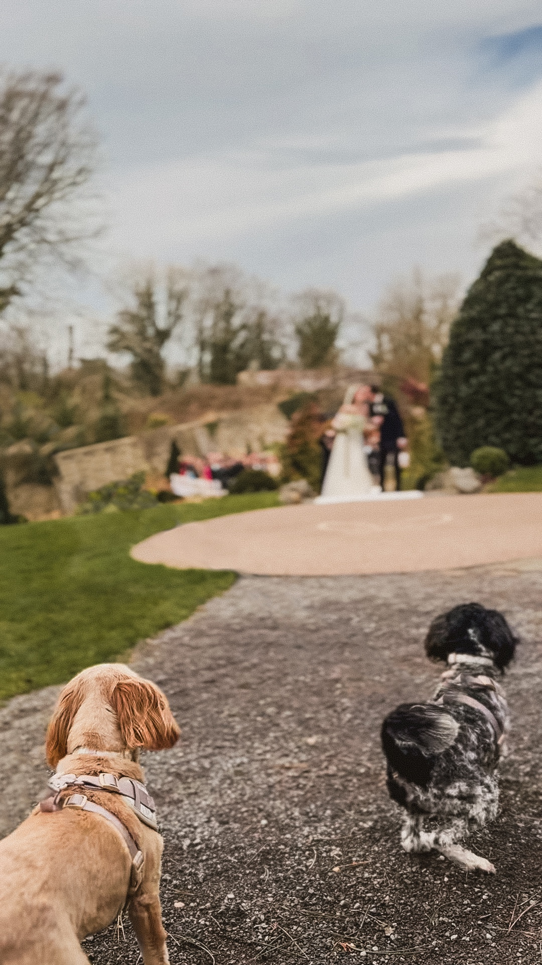 From there we went off for a rather windy walk at King Arthur’s Stone, where the girls both posed for some very lovely photographs! We then headed back to Fairyhill and arrived just in time to see the happy, newly betrothed couple walking up the aisle! Meg and Jini treated the newlyweds to some particularly enthusiastic tail wagging and cwtching!